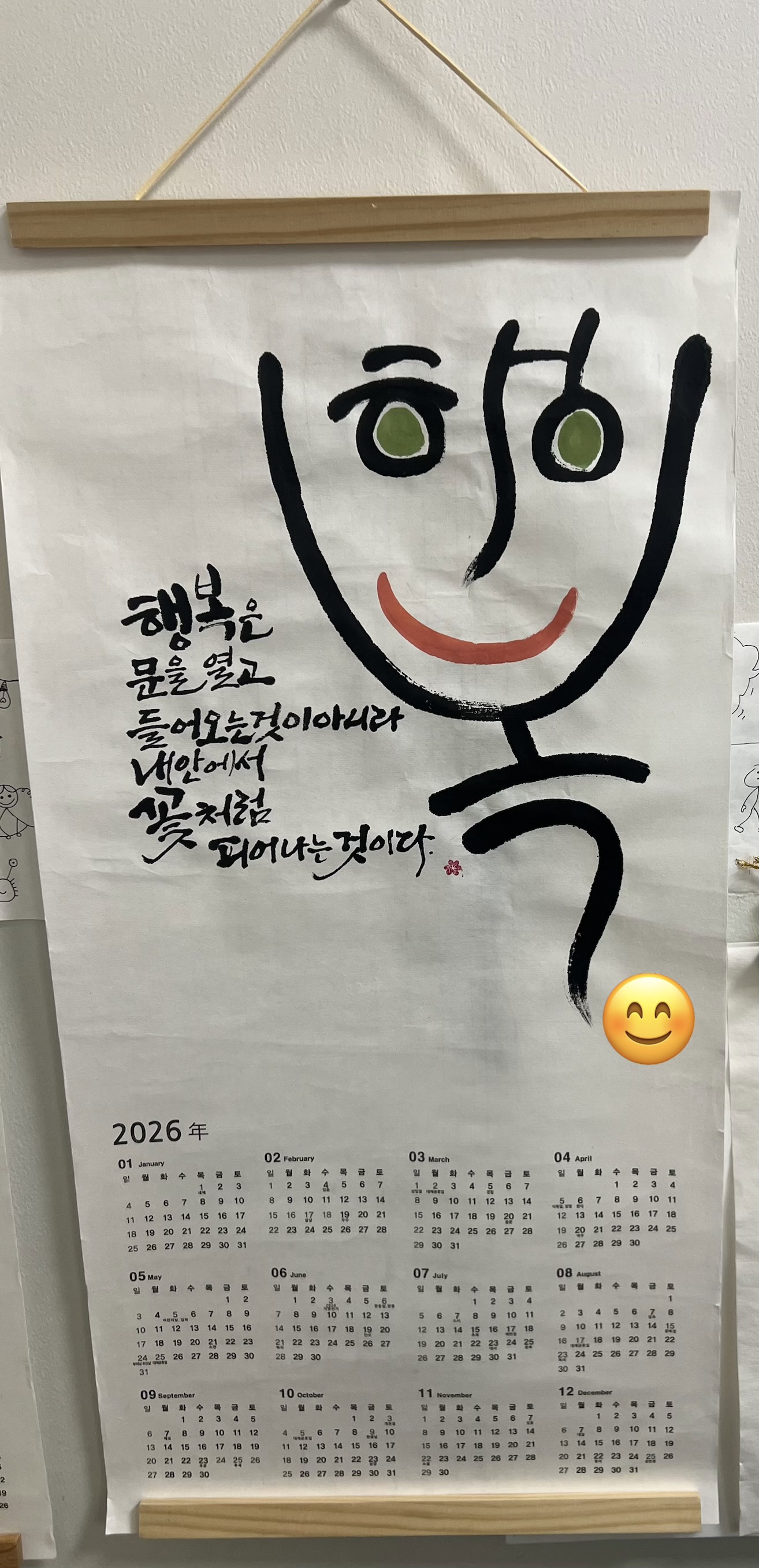 오늘 작품(?) 은, '행복'이라는 글자를 얼굴 형상으로 표현해, 보는 순간 미소가 번지도록 만든 캘리그라피를 이용한 달력입니다.