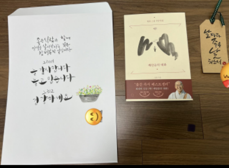 다이소에 가서 각대 봉투를 사서 그림과 글씨를 쓰고, 요즘 읽고 큰 깨달음을 얻은 책을 준비하고, 책갈피에도 쓰고 싶은 글귀와 인장을 찍었답니다.