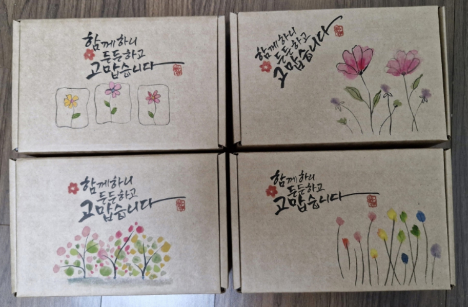 다이소에서 1000원이면 구입이 가능한 무지 상자4개, 무지 쇼핑백3개를 가지고 캘리그라피와 약간의 수채화로 꾸몄답니다.